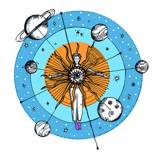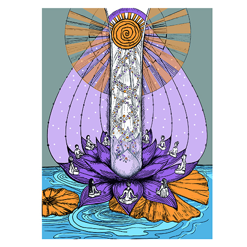 I focus on metaphysical, mystical, shamanic and consciousness themes. I like to compose with loose and untidy spots combined with detailed drawing. And above all, a lot, a loooot of color.